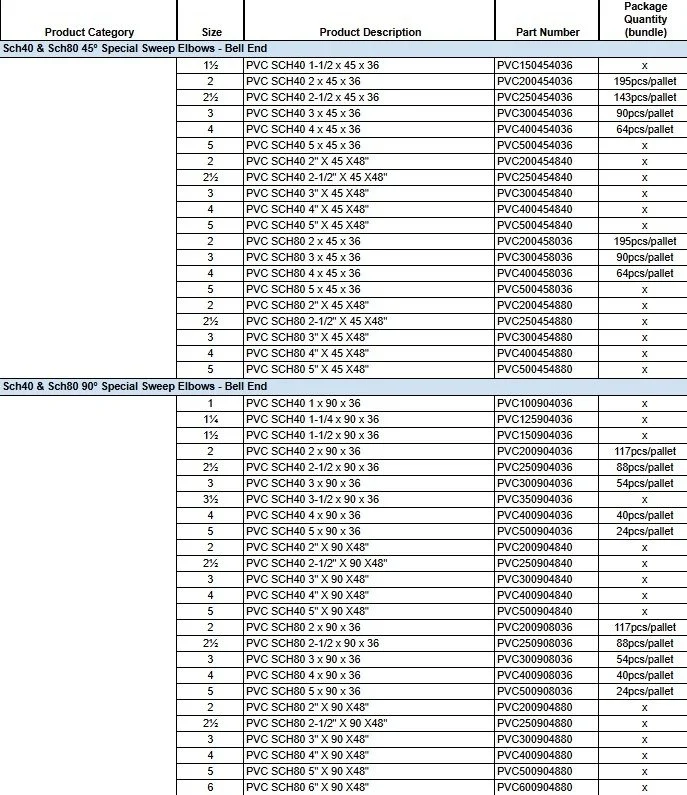 PVC SPECIAL SWEEP ELBOWS 45°/90° SCH40/80